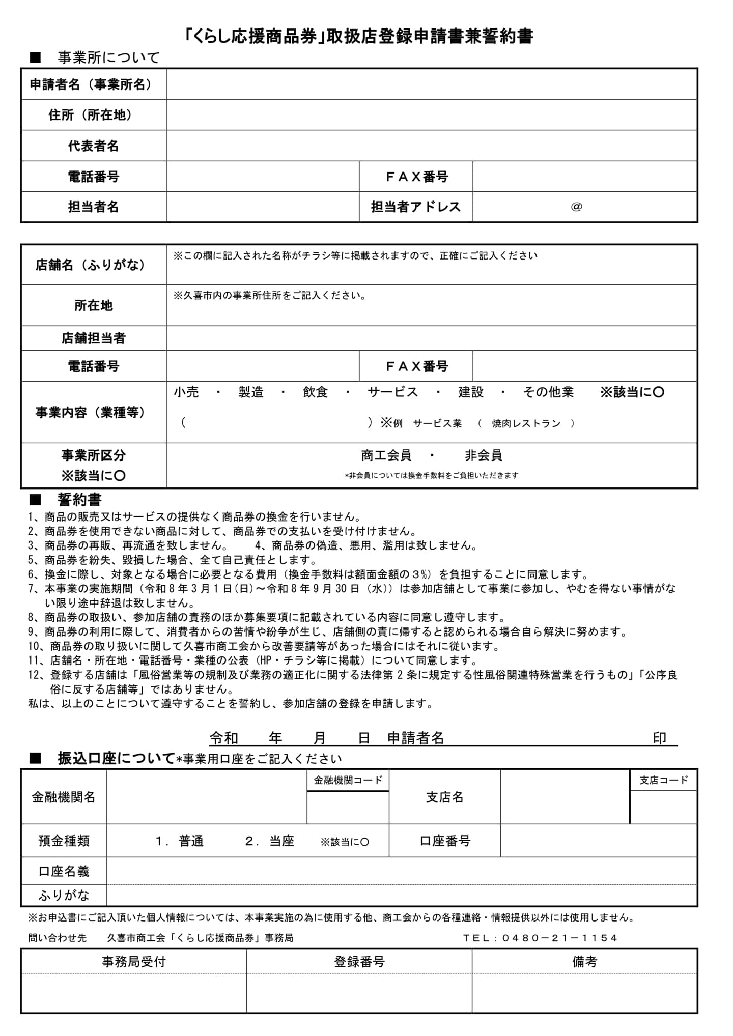 2 取扱店登録を希望される場合は、本「募集要領」に同意のうえ、別紙「取扱店登録申請書兼誓約書」もしくはホームページ(https://kukishi-kurashishohinken.com)内のWEBフォームに必要事項を記入し、令和8年1月5日(月)午後5時までに、窓口受付、郵送、FAX、WEBいずれかの方法で最寄の商工会本支所へお申し込み下さい。なお、上記期限を過ぎた場合でも申し込みは受け付けますが、市民配布用の「取扱店名簿(印刷物)」には店舗名が掲載されませんのでご注意ください。